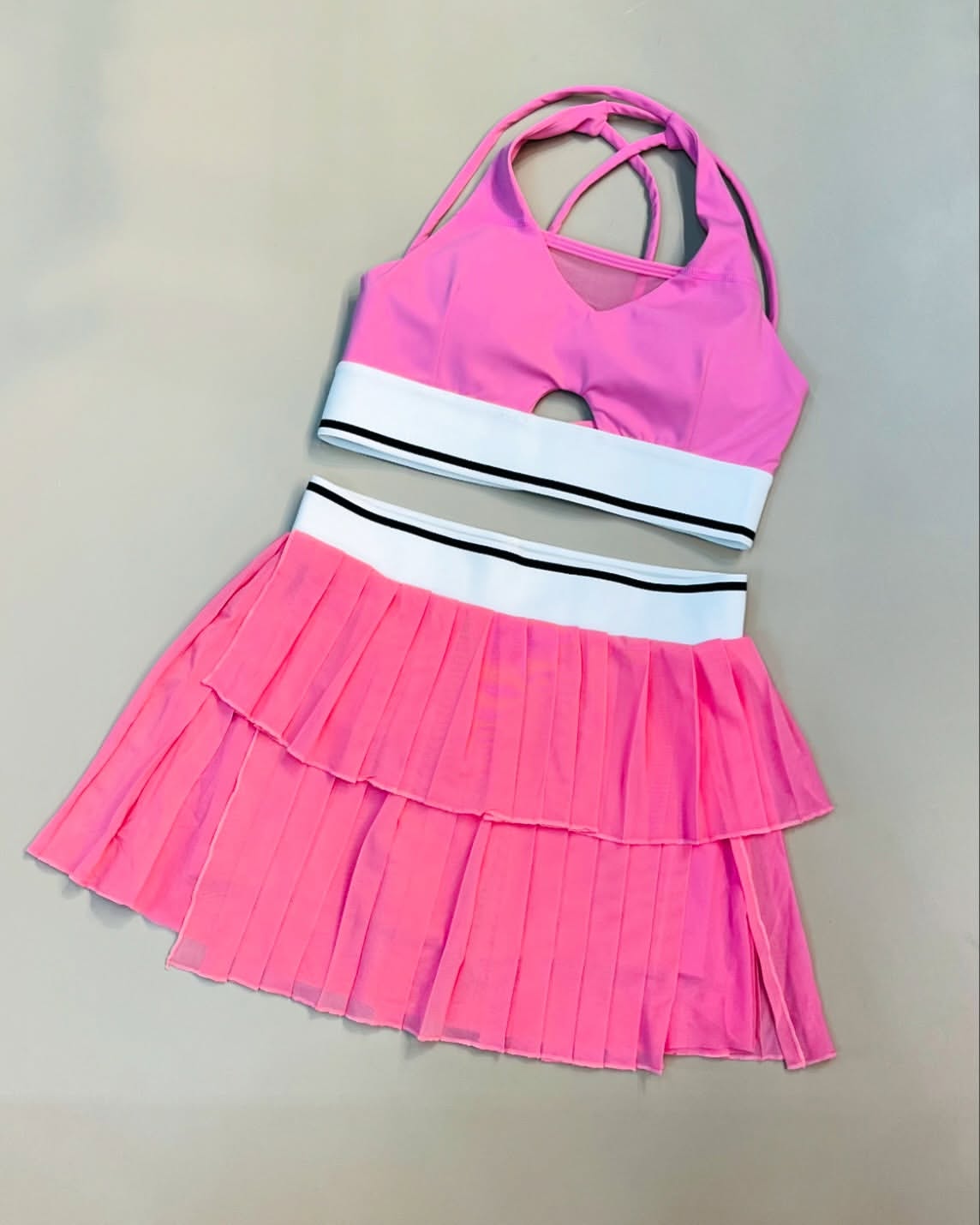 ست کاربردی و خفن که هم برای باشگاه هم برای تنیس عالیه. کاپ نیمتنه متحرک و کمر دامن کش دار.